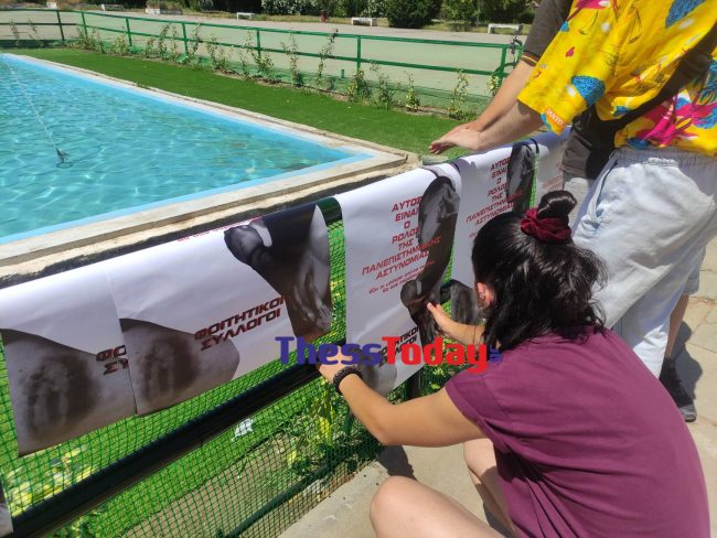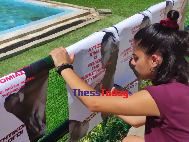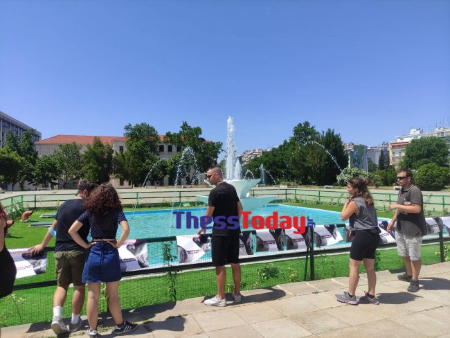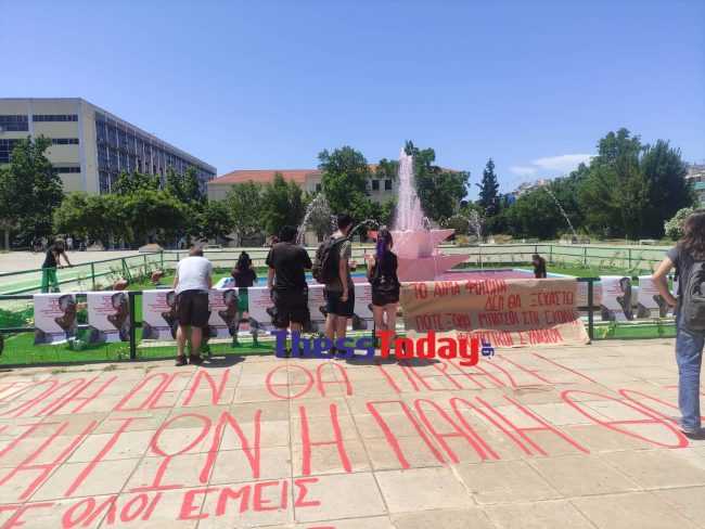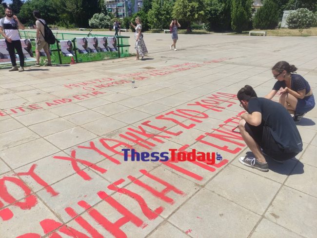 Οι φοιτητές έριξαν κόκκινη μπογιά στο συντριβάνι, ενώ νωρίτερα κόλλησαν αφίσες στο σημείο με την εικόνα του αιμόφυρτου φοιτητή τους και της Σοφίας Χατζοπούλου, που έφερε στο χέρι της τραυματισμό από γκλομπ, μετά από επεισόδια στο ΑΠΘ.