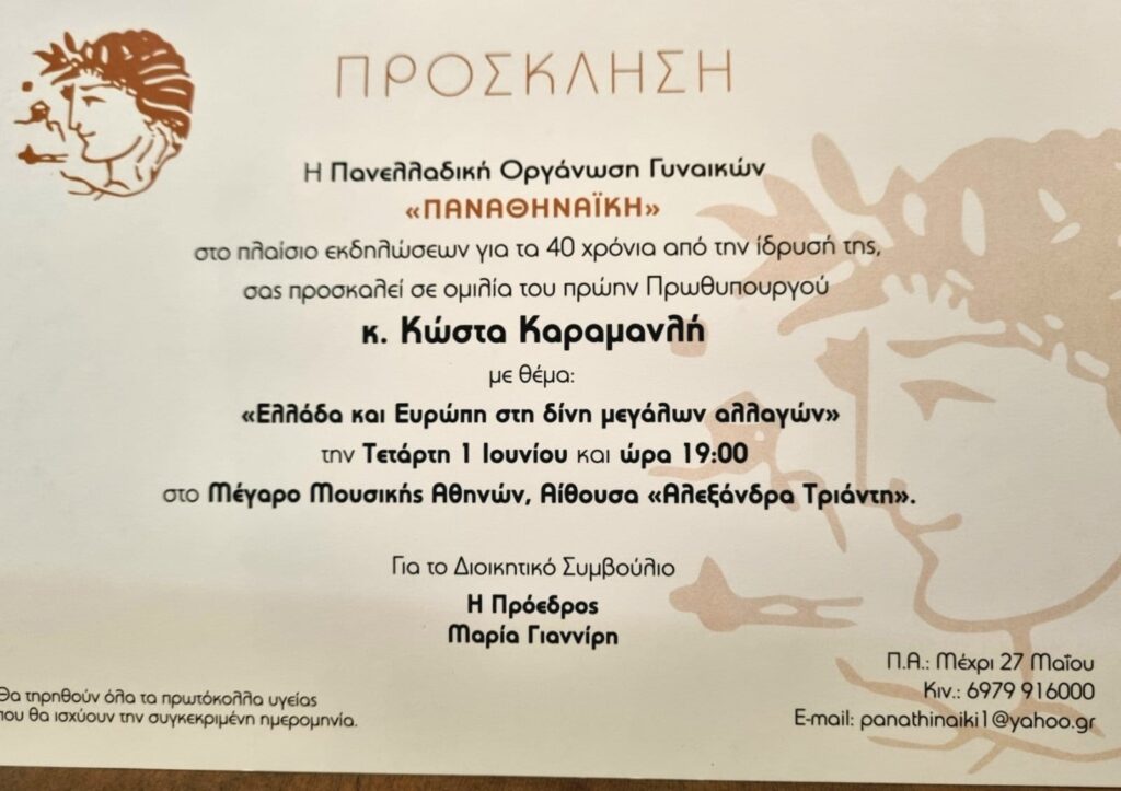 Ο πρόεδρος της ΕΛΛΗΝΙΚΗΣ ΑΝΑΤΡΟΠΗΣ, κ. Πάρις Κουρτζίδης, μετά από πρόσκληση που έλαβε, δήλωσε παρών στην ομιλία του πρώην πρωθυπουργού Κώστα Καραμανλή, με αφορμή την επετειακή εκδήλωση της πανελλαδικής οργάνωσης γυναικών “ΠΑΝΑΘΗΝΑΪΚΗ”, καθότι γνώριζε ότι αυτή θα είχε ιδιαίτερα σημαντική εθνική σημασία, σε μια πολύ κρίσιμη στιγμή για την Ελλάδα, αλλά και ολόκληρη την ανθρωπότητα.