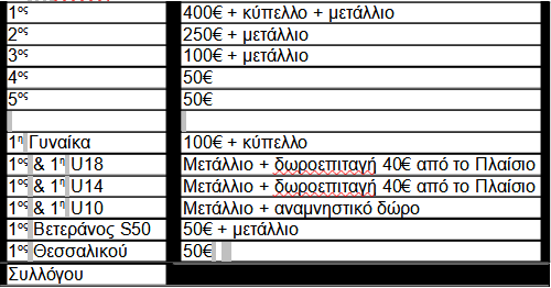 Τα έπαθλα δεν μοιράζονται και αποδίδονται στους νικητές σύμφωνα με την τελική κατάταξη.