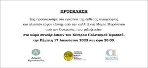 Ανακοινώσεις Πολιτισμός ΕΚΘΕΣΗ ΑΓΙΟΓΡΑΦΙΑΣ ΚΑΙ ΓΛΥΠΤΩΝ ΕΡΓΩΝ ΤΕΧΝΗΣ ΣΤΟ ΚΕΝΤΡΟ ΠΟΛΙΤΙΣΜΟΥ ΙΕΡΙΣΣΟΥ Πλοήγηση άρθρων Προηγούμενο Previous post: Γιορτάζουμε, τιμούμε, διεκδικούμε. Για τη Θεσσαλονίκη μας. Για την Πατρίδα μαςΕπόμενο Next post: ΟΙ ΠΡΩΤΟΙ 120 ΥΠΟΨΗΦΙΟΙ ΤΗΣ ΛΑΪΚΗΣ ΣΥΣΠΕΙΡΩΣΗΣ ΣΤΟ ΔΗΜΟ ΘΕΡΜΗΣ ΣΧΕΤΙΚΑ ΑΡΘΡΑ Υπεράνω όλων η παράδοση Εργασίες διαγράμμισης από την Περιφέρεια Κεντρικής Μακεδονίας στην Περιφερειακή Οδό Θεσσαλονίκης κατά τις νυχτερινές ώρες Πανσέληνες Νύχτες στην Κασσάνδρα: Μουσική Μυσταγωγία στο Ιερό του Άμμωνος Διός Αφήστε μια απάντηση Ακύρωση απάντησηςΗ ηλ. διεύθυνση σας δεν δημοσιεύεται. Τα υποχρεωτικά πεδία σημειώνονται με *Σχόλιο * Όνομα * Email * Ιστότοπος Αποθήκευσε το όνομά μου, email, και τον ιστότοπο μου σε αυτόν τον πλοηγό για την επόμενη φορά που θα σχολιάσω. Δ Current ye@r * Leave this field empty
