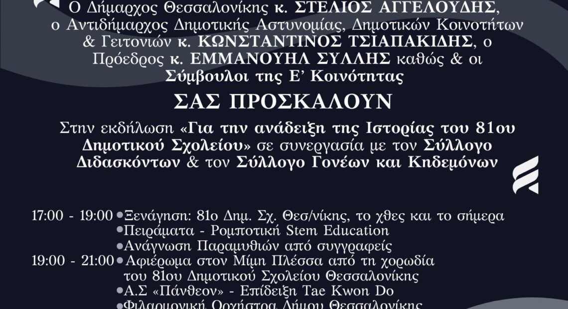 Ο Δήμαρχος Θεσσαλονίκης Στέλιος Αγγελούδης, ο Αντιδήμαρχος Δημοτικής Αστυνομίας, Δημοτικών Κοινοτήτων & Γειτονιών Κωνσταντίνος Τσιαπακίδης και ο Πρόεδρος της Ε’ Δημοτικής Κοινότητας Εμμανουήλ Σύλλης σας προσκαλούν το Σάββατο 12 Οκτωβρίου 2024 και ώρα 17:00 στην εκδήλωση «Ανάδειξη της Ιστορίας του 81ου Δημοτικού Σχολείου» σε συνεργασία με το Σύλλογο Διδασκόντων & το Σύλλογο Γονέων και Κηδεμόνων του σχολείου.