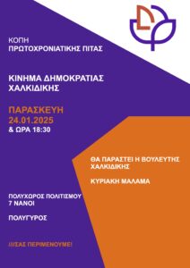 Σας προσκαλούμε στην κοπή της Πρωτοχρονιάτικης πίτας του Κινήματος Δημοκρατίας Χαλκιδικής.