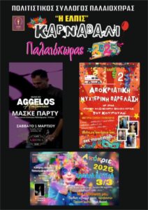 Ξεκινούν οι αποκριάτικες εκδηλώσεις στην Παλαιόχωρα, με την συνδρομή του Πολιτιστικού Συλλόγου “Η Ελπίς”, από το Σάββατο 1 Μαρτίου με το maske party, ακολουθεί η αποκριάτικη νυχτερινή παρέλαση την Κυριακή 2 Μαρτίου με αποκορύφωμα τις εκδηλώσεις που θα λάβουν χώρα στην κεντρική πλατεία της Παλαιόχωρας την Καθαρά Δευτέρα.