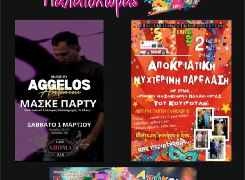 Ξεκινούν οι αποκριάτικες εκδηλώσεις στην Παλαιόχωρα, με την συνδρομή του Πολιτιστικού Συλλόγου “Η Ελπίς”, από το Σάββατο 1 Μαρτίου με το maske party, ακολουθεί η αποκριάτικη νυχτερινή παρέλαση την Κυριακή 2 Μαρτίου με αποκορύφωμα τις εκδηλώσεις που θα λάβουν χώρα στην κεντρική πλατεία της Παλαιόχωρας την Καθαρά Δευτέρα.
