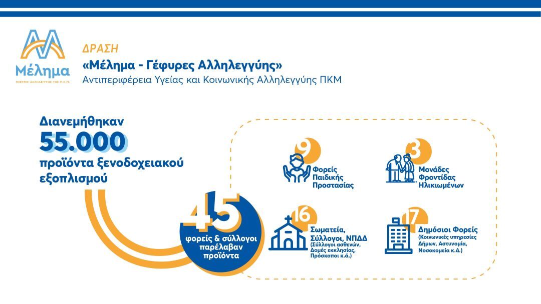 Με την πρώτη δράση του προγράμματος «Μέλημα» εξασφαλίστηκε η παράδοση ξενοδοχειακού εξοπλισμού από επιχειρήσεις που έχουν διακόψει τη λειτουργία τους σε δομές της Κεντρικής Μακεδονίας. Ήδη διανεμήθηκαν περισσότερα από 55.000 είδη ξενοδοχειακού εξοπλισμού σε φορείς και συλλόγους της Περιφέρειας Κεντρικής Μακεδονίας. Τα είδη αυτά διατέθηκαν σε 45 φορείς και, συγκεκριμένα, σε εννέα φορείς παιδικής προστασίας, 16 συλλόγους, σωματεία και ΝΠΔΔ, τρεις μονάδες φροντίδας ηλικιωμένων και 17 δημόσιους φορείς, μεταξύ των οποίων κοινωνικές υπηρεσίες δήμων, υπηρεσίες της αστυνομίας, νοσοκομεία και κέντρα υγείας.