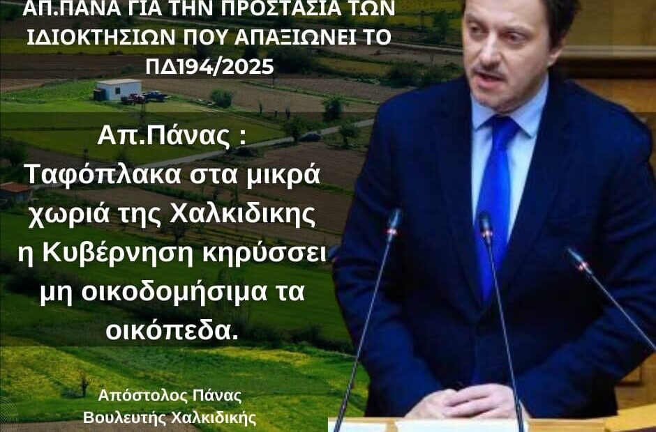 Ο κ. Πάνας τονίζει ότι, με το ΠΔ 194/2025, πλήττονται βάναυσα κληρονομημένες μικροϊδιοκτησίες γύρω από οικισμούς σε δήμους όπως η Κασσάνδρα, η Σιθωνία, ο Αριστοτέλης ο Πολύγυρος και η Προποντίδα, δημιουργείται άνιση μεταχείριση ανάμεσα σε όμορες εκτάσεις,