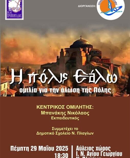 Νέα Πλάγια, Χαλκιδική – Μια ιδιαίτερα συγκινητική εκδήλωση μνήμης για την Άλωση της Κωνσταντινούπολης, που σημάδεψε ανεξίτηλα την ιστορία του Ελληνισμού και της Ορθοδοξίας, διοργανώνεται στα Νέα Πλάγια. Ο Πολιτιστικός Σύλλογος Νέων Πλαγίων, σε συνεργασία με τον Δήμο Νέας Προποντίδας, σας προσκαλεί την Πέμπτη 29 Μαΐου 2025, στις 18:30, στον αύλειο χώρο του Ιερού Ναού Αγίου Γεωργίου Ν. Πλαγίων.