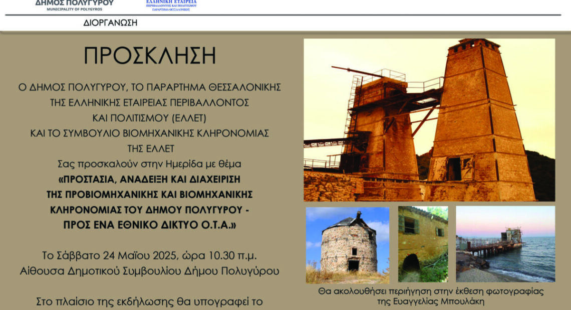 Ο Δήμος Πολυγύρου και η Ελληνική Εταιρία Περιβάλλοντος και Πολιτισμού- Παράρτημα Θεσσαλονίκης (ΕΛΛΕΤ- ΠΘ), διοργανώνουν ημερίδα με θέμα: “Προστασία, Ανάδειξη και Διαχείριση της Βιομηχανικής Κληρονομιάς της Περιοχής Πολυγύρου- Προς ένα Εθνικό