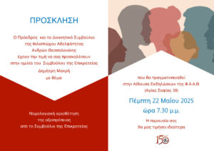 Η ομιλία θα πραγματοποιηθεί την Πέμπτη 22 Μαΐου 2025 και ώρα 7.30 μ.μ. στην Αίθουσα Εκδηλώσεων της Φ.Α.Α.Θ. (Αγίας Σοφίας 38).