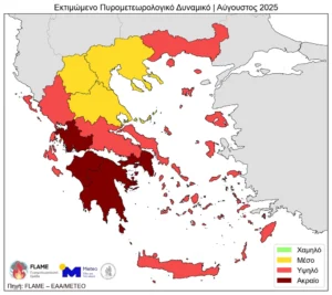 Οι εποχικές προγνώσεις για τον Αύγουστο του 2025 υποδεικνύουν αρκετά υψηλότερες θερμοκρασίες και συνθήκες έντονης ατμοσφαιρικής ξηρασίας. Αυτές οι συνθήκες αναμένεται να αναβαθμίσουν σημαντικά το πυρομετεωρολογικό δυναμικό: