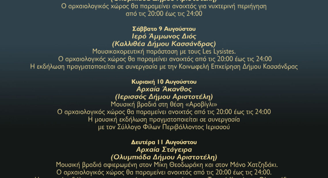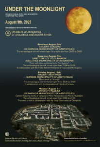 Στο πλαίσιο του θεσμού της Αυγουστιάτικης πανσελήνου, η Εφορεία Αρχαιοτήτων Χαλκιδικής και Αγίου Όρους σας προσκαλεί το Σάββατο 9, την Κυριακή 10 και τη Δευτέρα 11 Αυγούστου να απολαύσετε το φεγγάρι σε κάποιον από τους παρακάτω αρχαιολογικούς χώρους: