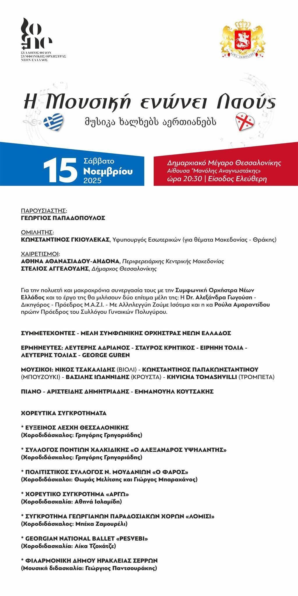 Η εκδήλωση, με τίτλο «Η Μουσική Ενώνει Λαούς», είναι πρωτοβουλία του Συλλόγου Φίλων της Συμφωνικής Ορχήστρας Νέων Ελλάδος και του Γενικού Προξενείου της Γεωργίας στη Θεσσαλονίκη.