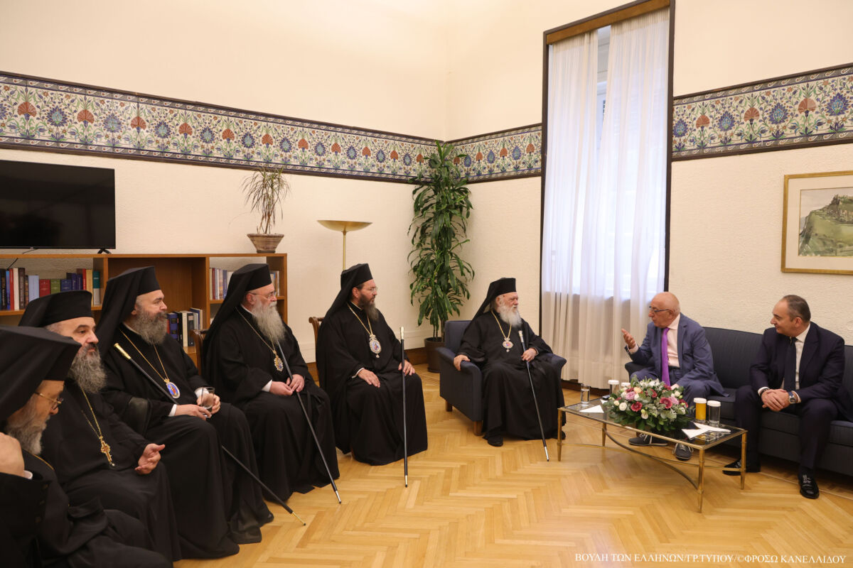 Ο Πρόεδρος της Βουλής των Ελλήνων κ. Νικήτας Κακλαμάνης, με τον Α΄ Αντιπρόεδρο κ. Ιωάννη Πλακιωτάκη, υποδέχθηκαν τον Αρχιεπίσκοπο και τα μέλη της Ιεράς Συνόδου κατά την άφιξή τους στο Κοινοβούλιο και τους συνόδευσαν στο σαλόνι του Πρωθυπουργού στη Βουλή, όπου είχαν ολιγόλεπτη συνάντηση, καθώς και χαιρετισμό με τον Πρωθυπουργό κ. Κυριάκο Μητσοτάκη.