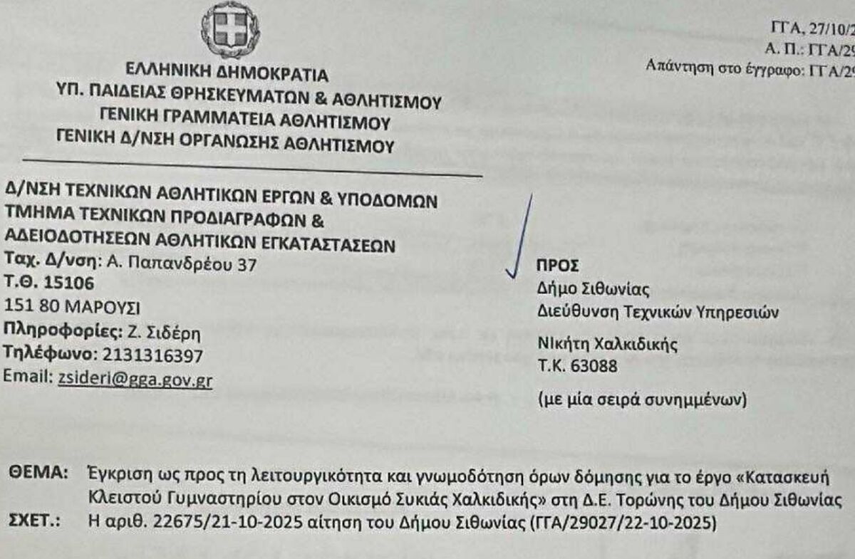 Με ιδιαίτερη ικανοποίηση, ο Δήμος Σιθωνίας ανακοινώνει ότι το έργο για την κατασκευή του νέου Κλειστού Γυμναστηρίου Συκιάς εισέρχεται στην τελική φάση υλοποίησης. Εγκρίθηκαν επιτέλους οι όροι δόμησης από τη Διεύθυνση Τεχνικών Αθλητικών Έργων και Υποδομών, ανοίγοντας τον δρόμο για την έναρξη του διαγωνισμού.