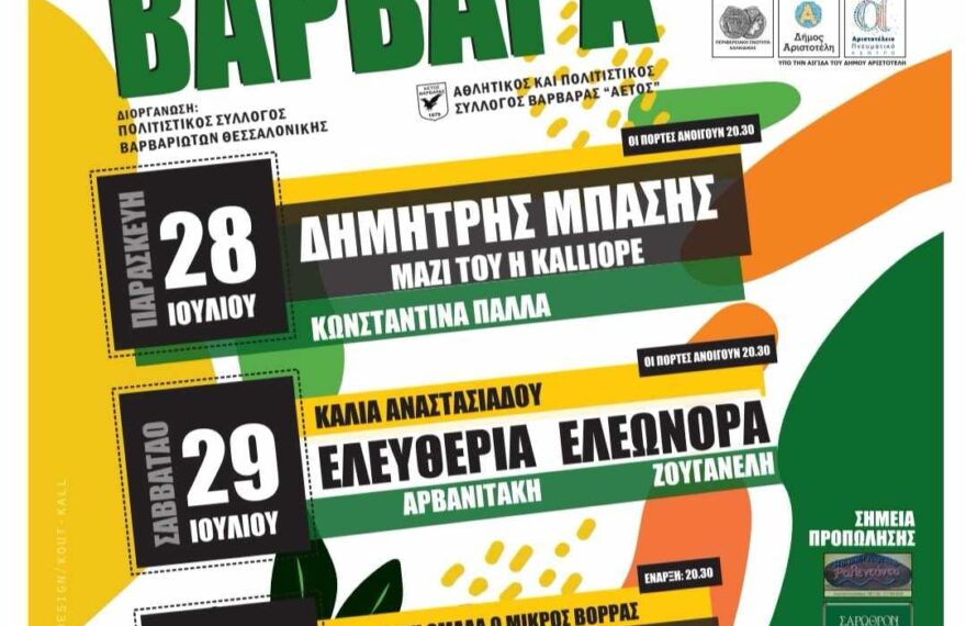 Με πλούσιο πρόγραμμα και τη συμμετοχή μερικών από τις πιο δημοφιλείς φωνές του ελληνικού πενταγράμμου, θα πραγματοποιηθεί το φετινό Φεστιβάλ Βαρβάρας το τριήμερο 28-30 Ιουλίου, με εκδηλώσεις στο χώρο του Δημοτικού Σχολείου και στην κεντρική πλατεία του οικισμού, μέσα στο καταπράσινο περιβάλλον της ορεινής Χαλκιδικής. Στο Δημοτικό Σχολείο της Βαρβάρας, θα εμφανιστούν: Την
