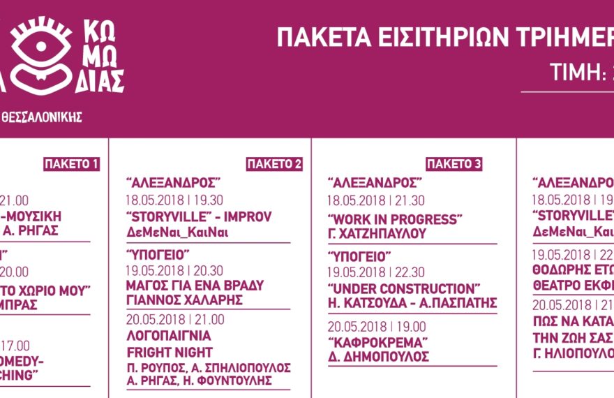 Ξεκίνησε, η προπώληση για το πρώτο Φεστιβάλ Κωμωδίας Θεσσαλονίκης! Έρχονται, περισσότεροι από 40 καταξιωμένοι και ανερχόμενοι καλλιτέχνες από την Ελλάδα και το εξωτερικό, να παρουσιάσουν τη δουλειά τους. Θέατρο, stand up comedy, improv comedy, comix – σκίτσο, χορός, θέατρο σκιών, κουκλοθέατρο, παιδικό θέατρο, μουσική κωμωδία, μαγικά, λογοπαίγνια, internet – youtube,