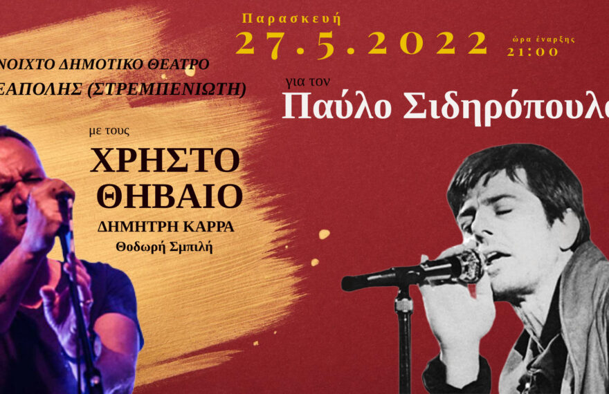 KazandB & BigNoise παρουσιάζουν: ΓΙΑ ΤΟΝ ΠΑΥΛΟ ΣΙΔΗΡΟΠΟΥΛΟ… • Συναυλία Αφιέρωμα με τον Χρήστο Θηβαίο, Δημήτρη Καρρά και Θοδωρή Σμπιλή. ΠΑΡΑΣΚΕΥΗ 27 ΜΑΪΟΥ 2022, ΘΕΣΣΑΛΟΝΙΚΗ ΑΝΟΙΧΤΟ ΘΕΑΤΡΟ ΝΕΑΠΟΛΗΣ Ένα μουσικό αφιέρωμα στον «πρίγκιπα» του ελληνικού ροκ που έφυγε νωρίς, σε ηλικία 42 ετών, στις 6 Δεκεμβρίου 1990. Σμίγοντας μοίρες με τους τρεις «J» της ροκ (Janis