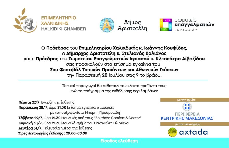 Το Φεστιβάλ τοπικών προϊόντων & Αθωνικών Γεύσεων 2023 θα πραγματοποιηθεί σε συνεργασία με τον Δήμο Αριστοτέλη και το Σωματείο Επαγγελματιών Ιερισσού στην παραλία της Ιερισσού το διάστημα 27 – 31 Ιουλίου 2023. Οι εκθέτες θα προέρχονται αποκλειστικά από τον χώρο των τροφίμων και ποτών. Η έκθεση θα λειτουργεί τις ώρες 20:00 – 00:00. Τα εγκαίνια της […]