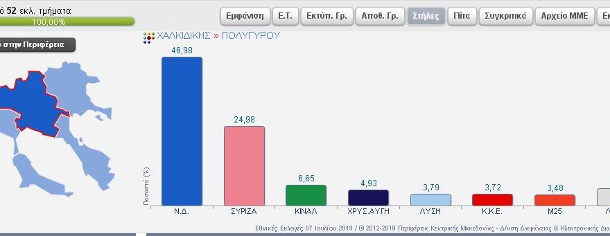 Συνδυασμός Ποσοστό Ψήφοι ΝΕΑ ΔΗΜΟΚΡΑΤΙΑ 37,76% 7.294 ΣΥΝΑΣΠΙΣΜΟΣ ΡΙΖΟΣΠΑΣΤΙΚΗΣ ΑΡΙΣΤΕΡΑΣ 23,84% 4.605 Κίνημα Αλλαγής 14,38% 2.777 ΛΑΪΚΟΣ ΣΥΝΔΕΣΜΟΣ – ΧΡΥΣΗ ΑΥΓΗ 5,81% 1.122 ΕΛΛΗΝΙΚΗ ΛΥΣΗ – ΚΥΡΙΑΚΟΣ ΒΕΛΟΠΟΥΛΟΣ 4,96% 959 ΜέΡΑ25 3,87% 747 ΚΟΜΜΟΥΝΙΣΤΙΚΟ ΚΟΜΜΑ ΕΛΛΑΔΑΣ 2,66% 513 ΠΛΕΥΣΗ ΕΛΕΥΘΕΡΙΑΣ-ΖΩΗ ΚΩΝΣΤΑΝΤΟΠΟΥΛΟΥ 1,82% 351 ΕΝΩΣΗ ΚΕΝΤΡΩΩΝ 1,58% 306 ΔΗΜΙΟΥΡΓΙΑ ΞΑΝΑ