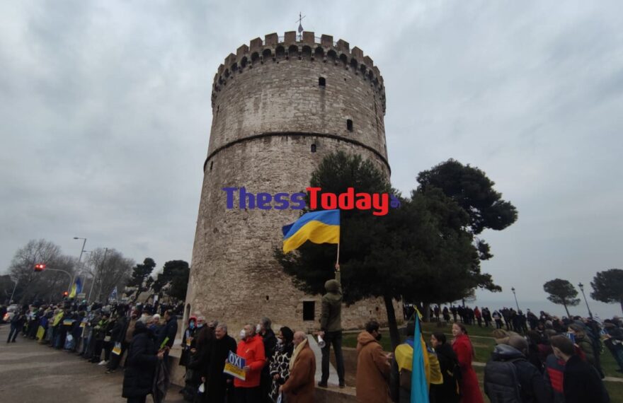 «Όχι στον πόλεμο» φώναξαν πολίτες της Θεσσαλονίκης, που με τα χέρια τους ενωμένα σφιχτά δημιούργησαν μια τεράστια ανθρώπινη αλυσίδα ειρήνης γύρω από τον Λευκό Πύργο, διατρανώνοντας το μήνυμα υπέρ του ανθρωπισμού και κατά του πολέμου. Στη μαζική εκδήλωση ειρήνης που πραγματοποιείται το απόγευμα της Τρίτης, συμμετέχουν αυτοδιοικητικοί, δικηγόροι, πανεπιστημιακοί, νεολαίοι,