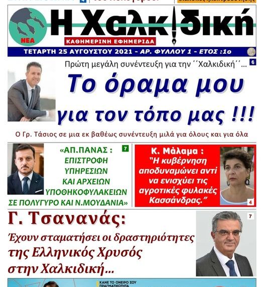 Πρώτη μεγάλη συνέντευξη για την Χαλκιδική… Ο Πρόεδρος της Ένωσης Ξενοδόχων Χαλκιδικής, Πρόεδρος του ΠΟΞ, του τουριστικού Οργανισμού Χαλκιδικής και υποψήφιος Βουλευτής της Νέας Δημοκρατίας, Γρηγόρης Τάσιος μιλά στο πρώτο τεύχος της καθημερινής εφημερίδας μας για την Χαλκιδική, τον τουρισμό, τις υποδομές, την επόμενη μέρα, τις φωτιές, τις