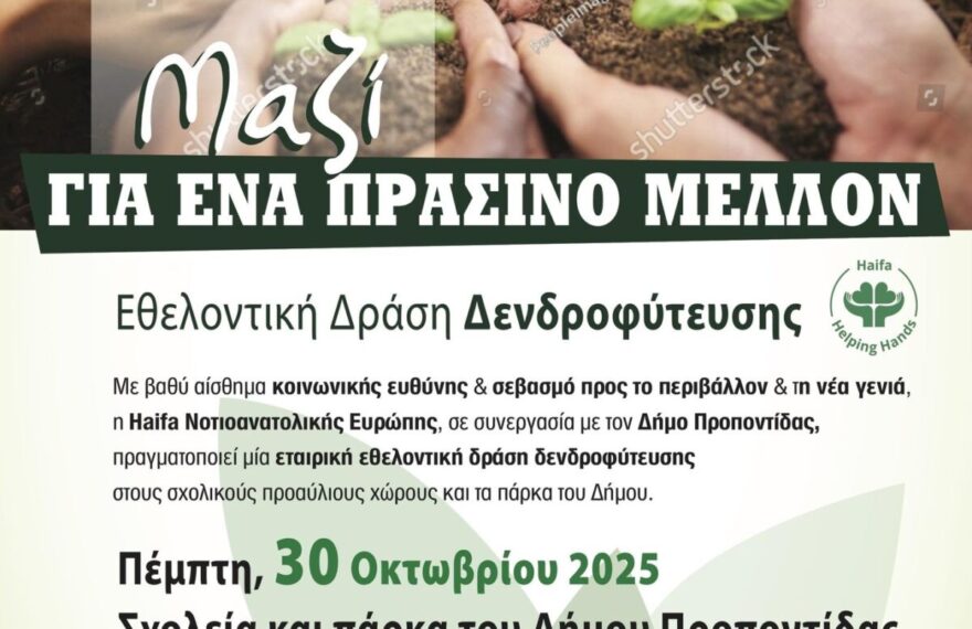 Ο Δήμος Προποντίδας, με γνώμονα την κοινωνική ευθύνη και τον σεβασμό προς το περιβάλλον και τις νέες γενιές, διοργανώνει, σε συνεργασία με την εταιρική κοινωνική ευθύνη της Haifa Νοτιοανατολικής Ευρώπης, μια μεγάλη εθελοντική δράση δενδροφύτευσης. Η εκδήλωση έχει στόχο την αισθητική αναβάθμιση και τον εμπλουτισμό των κοινόχρηστων χώρων του Δήμου με νέα δέντρα, συμβάλλοντας