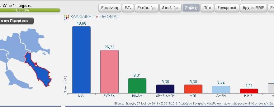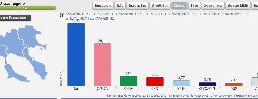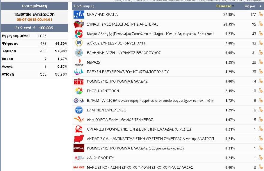Συνδυασμός Ποσοστό Ψήφοι ΝΕΑ ΔΗΜΟΚΡΑΤΙΑ 40,68% 2.950 ΣΥΝΑΣΠΙΣΜΟΣ ΡΙΖΟΣΠΑΣΤΙΚΗΣ ΑΡΙΣΤΕΡΑΣ 26,23% 1.902 Κίνημα Αλλαγής 9,01% 653 ΛΑΪΚΟΣ ΣΥΝΔΕΣΜΟΣ – ΧΡΥΣΗ ΑΥΓΗ 5,38% 390 ΜέΡΑ25 5,38% 390 ΕΛΛΗΝΙΚΗ ΛΥΣΗ – ΚΥΡΙΑΚΟΣ ΒΕΛΟΠΟΥΛΟΣ 4,44% 322 ΚΟΜΜΟΥΝΙΣΤΙΚΟ ΚΟΜΜΑ ΕΛΛΑΔΑΣ 2,91% 211 ΠΛΕΥΣΗ ΕΛΕΥΘΕΡΙΑΣ-ΖΩΗ ΚΩΝΣΤΑΝΤΟΠΟΥΛΟΥ 1,89% 137 ΕΝΩΣΗ ΚΕΝΤΡΩΩΝ 1,61% 117 ΔΗΜΙΟΥΡΓΙΑ ΞΑΝΑ