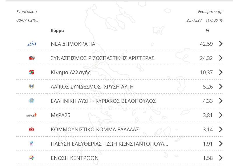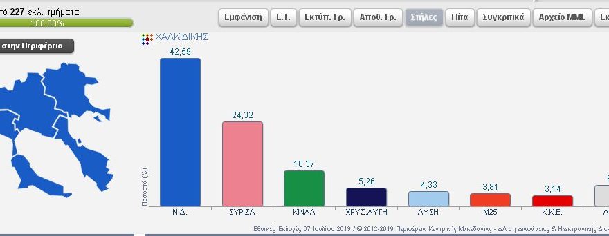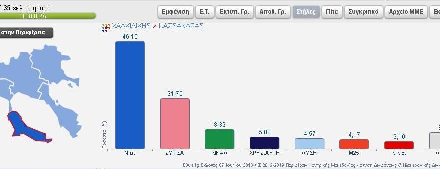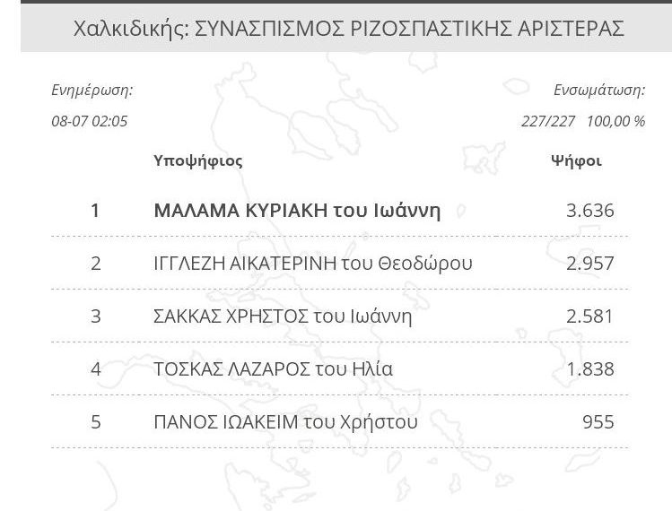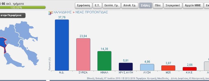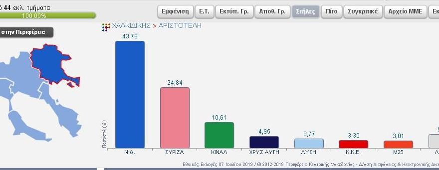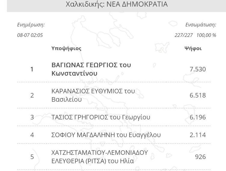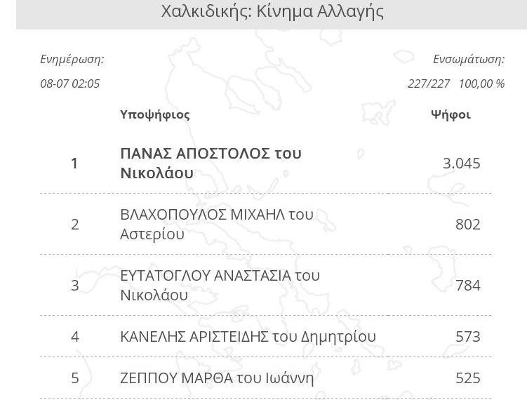 Συνδυασμός Ποσοστό Ψήφοι ΝΕΑ ΔΗΜΟΚΡΑΤΙΑ 37,76% 7.294 ΣΥΝΑΣΠΙΣΜΟΣ ΡΙΖΟΣΠΑΣΤΙΚΗΣ ΑΡΙΣΤΕΡΑΣ 23,84% 4.605 Κίνημα Αλλαγής 14,38% 2.777 ΛΑΪΚΟΣ ΣΥΝΔΕΣΜΟΣ – ΧΡΥΣΗ ΑΥΓΗ 5,81% 1.122 ΕΛΛΗΝΙΚΗ ΛΥΣΗ – ΚΥΡΙΑΚΟΣ ΒΕΛΟΠΟΥΛΟΣ 4,96% 959 ΜέΡΑ25 3,87% 747 ΚΟΜΜΟΥΝΙΣΤΙΚΟ ΚΟΜΜΑ ΕΛΛΑΔΑΣ 2,66% 513 ΠΛΕΥΣΗ ΕΛΕΥΘΕΡΙΑΣ-ΖΩΗ ΚΩΝΣΤΑΝΤΟΠΟΥΛΟΥ 1,82% 351 ΕΝΩΣΗ ΚΕΝΤΡΩΩΝ 1,58% 306 ΔΗΜΙΟΥΡΓΙΑ ΞΑΝΑ