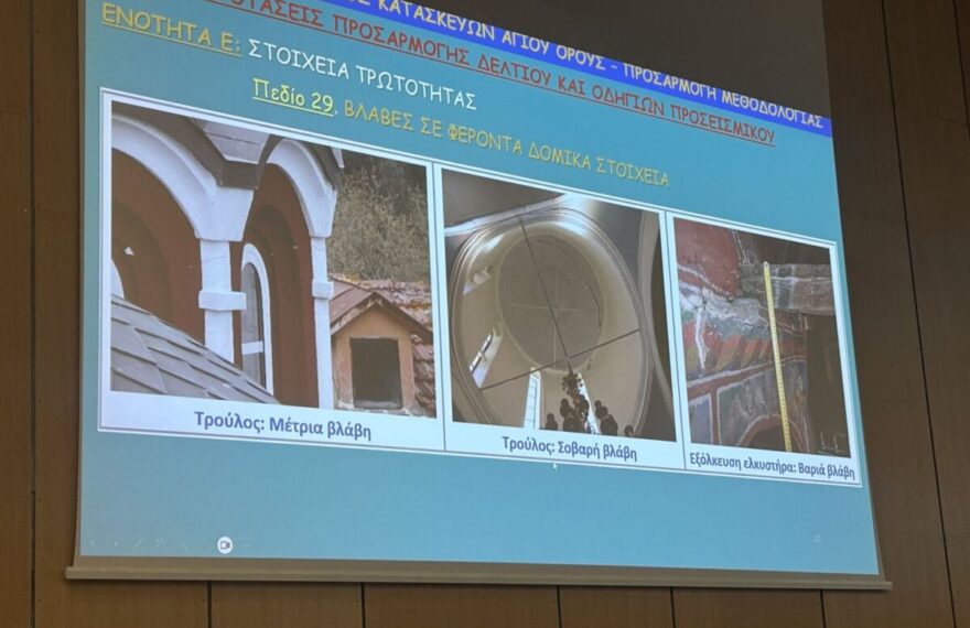 Η πρόσφατη, παρατεταμένη σεισμική ακολουθία στο Άγιο Όρος έφερε στο προσκήνιο την ανάγκη για άμεση καταγραφή και αποκατάσταση των ζημιών στις μοναδικές κατασκευές της Αθωνικής Πολιτείας. Παρότι οι ζημιές είναι περιορισμένες και η κατάσταση δεν χαρακτηρίζεται επικίνδυνη, η δράση των αρμόδιων φορέων είναι άμεση. Ειδική Ομάδα Εργασίας, αποτελούμενη από το ΤΕΕ/ΤΚΜ, το Α.Π.Θ.,