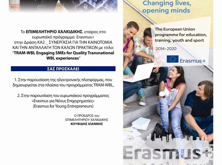 To ΕΠΙΜΕΛΗΤΗΡΙΟ ΧΑΛΚΙΔΙΚΗΣ, που συμμετέχει ως εταίρος στο ευρωπαϊκό πρόγραμμα Erasmus + στην Δράση ΚΑ2 _ ΣΥΝΕΡΓΑΣΙΑ ΓΙΑ ΤΗΝ ΚΑΙΝΟΤΟΜΙΑ ΚΑΙ ΤΗΝ ΑΝΤΑΛΛΑΓΗ ΤΩΝ ΚΑΛΩΝ ΠΡΑΚΤΙΚΩΝ με τίτλο : “TRAM-WBL Engaging SMEs for Quality Transnational WBL experiences”, προσκαλεί τις επιχειρήσεις – μέλη του, τους εκπαιδευτικούς και τους σπουδαστές της επαγγελματικής εκπαίδευσης και